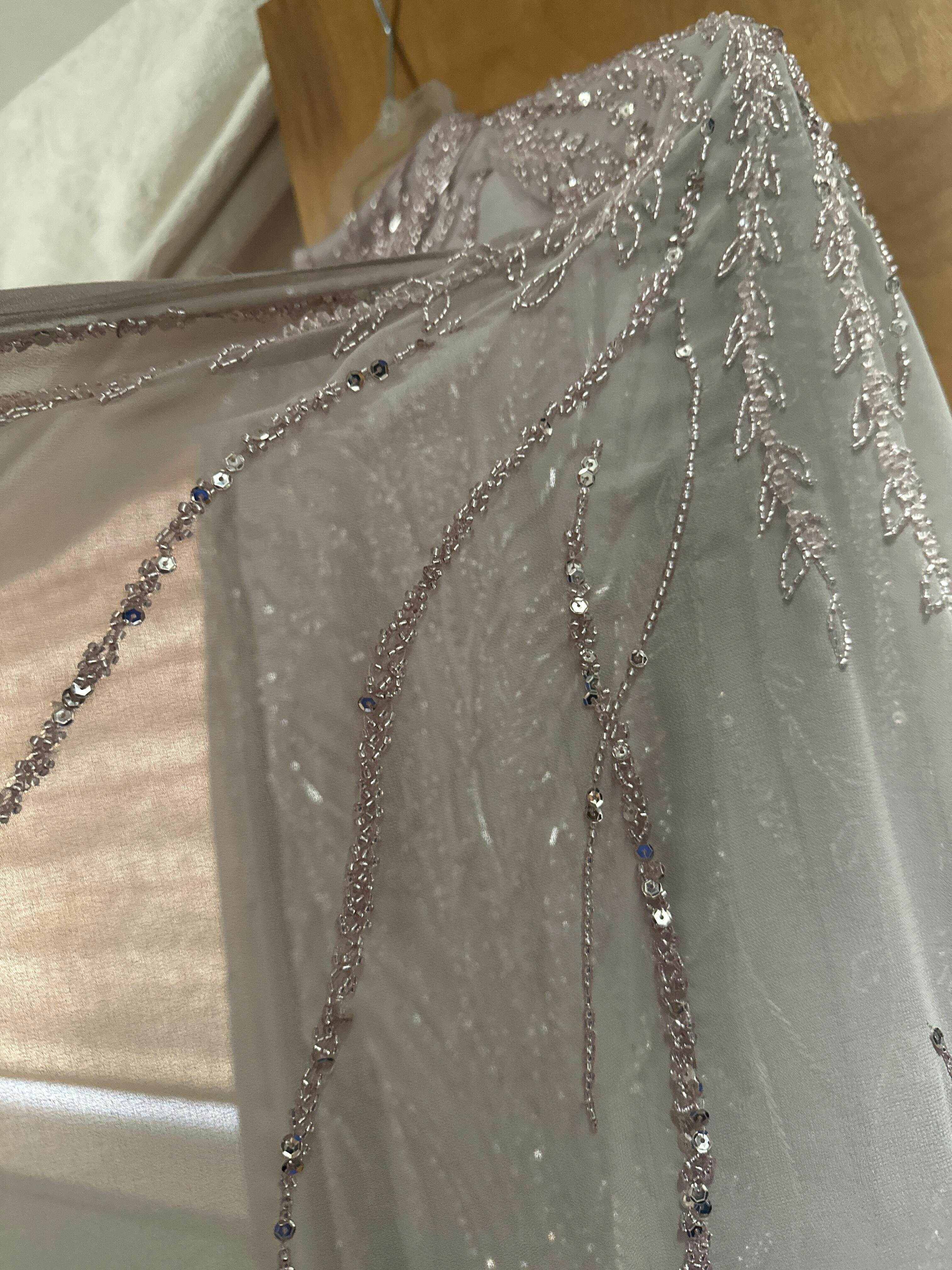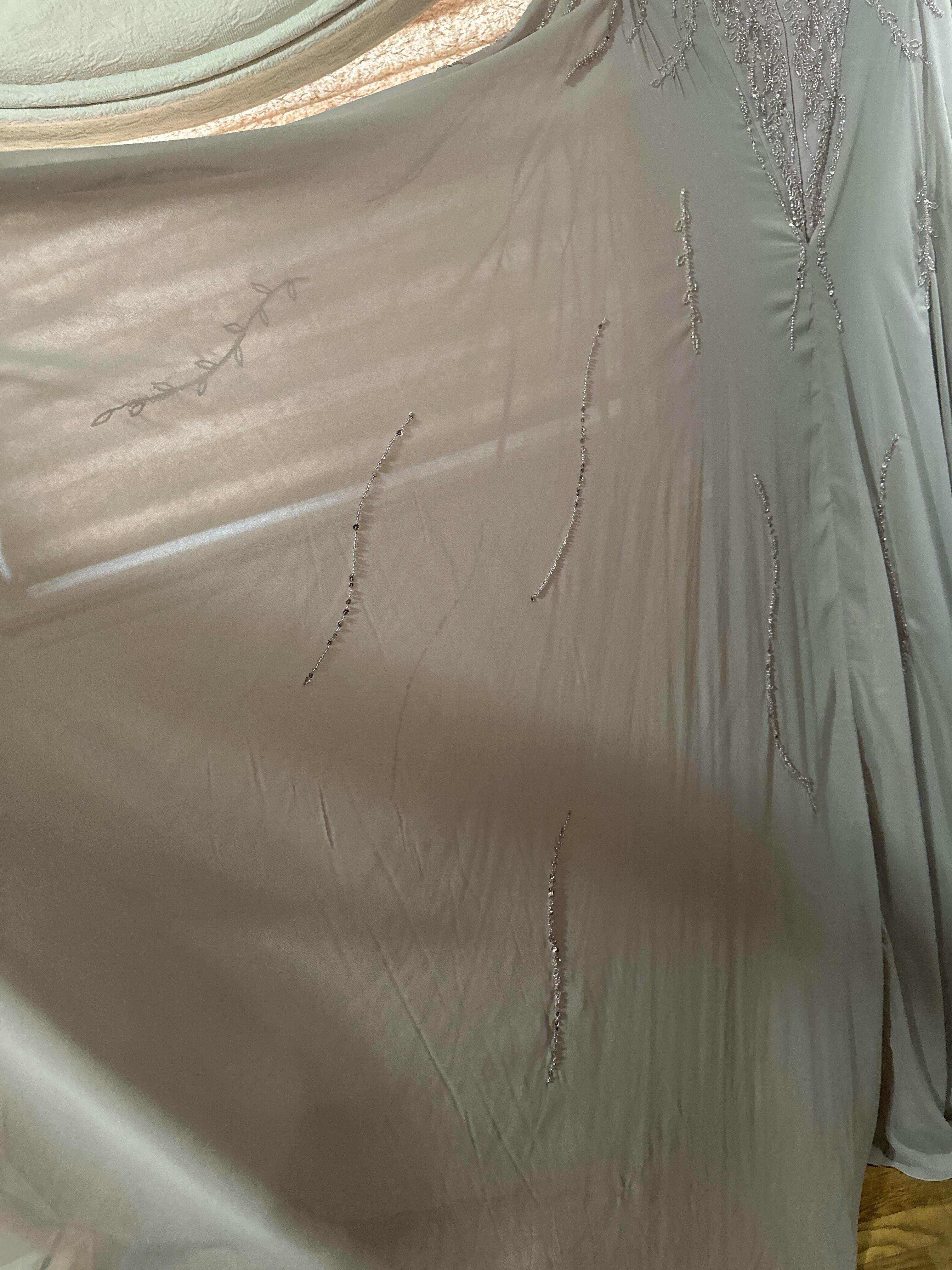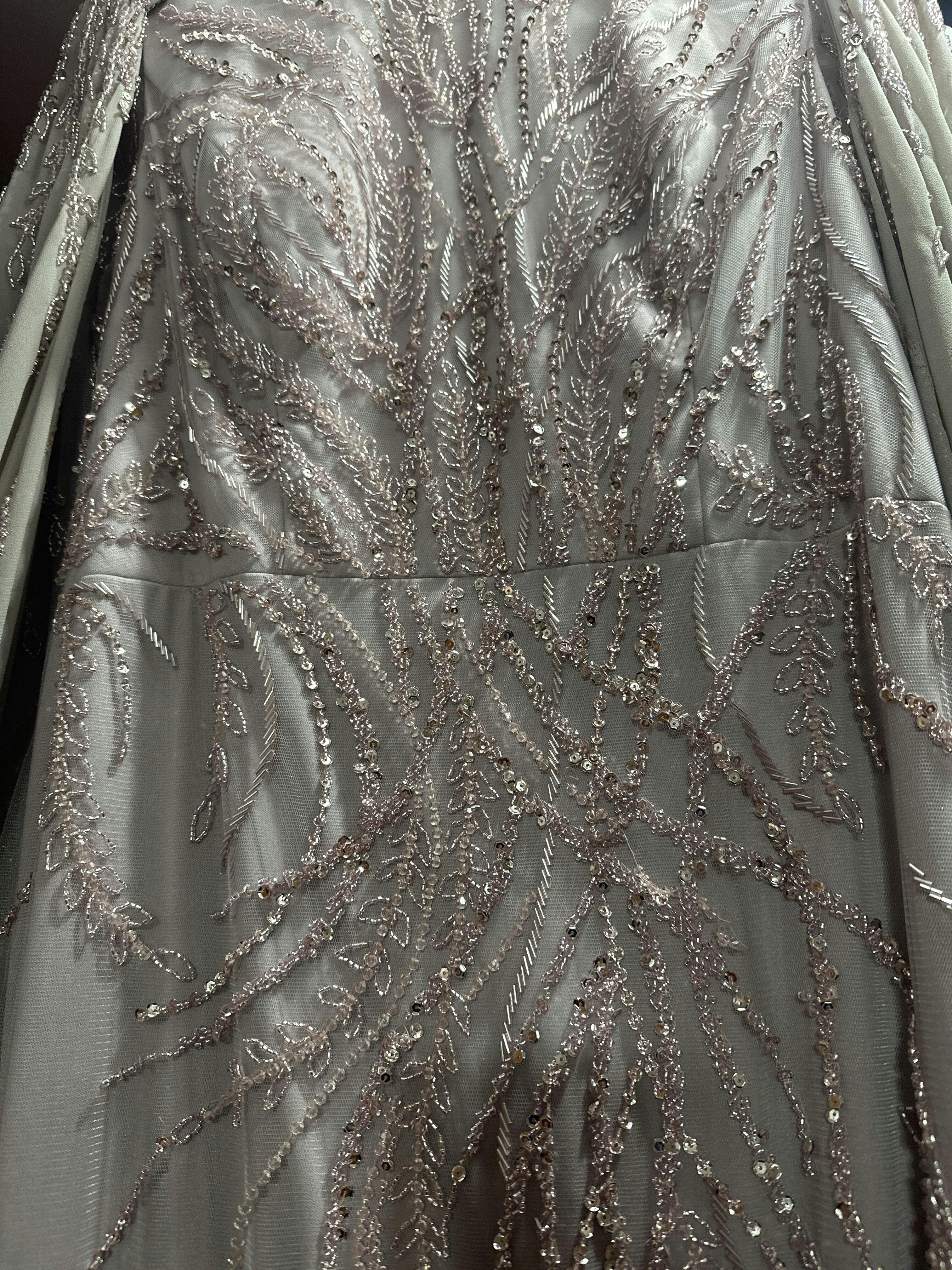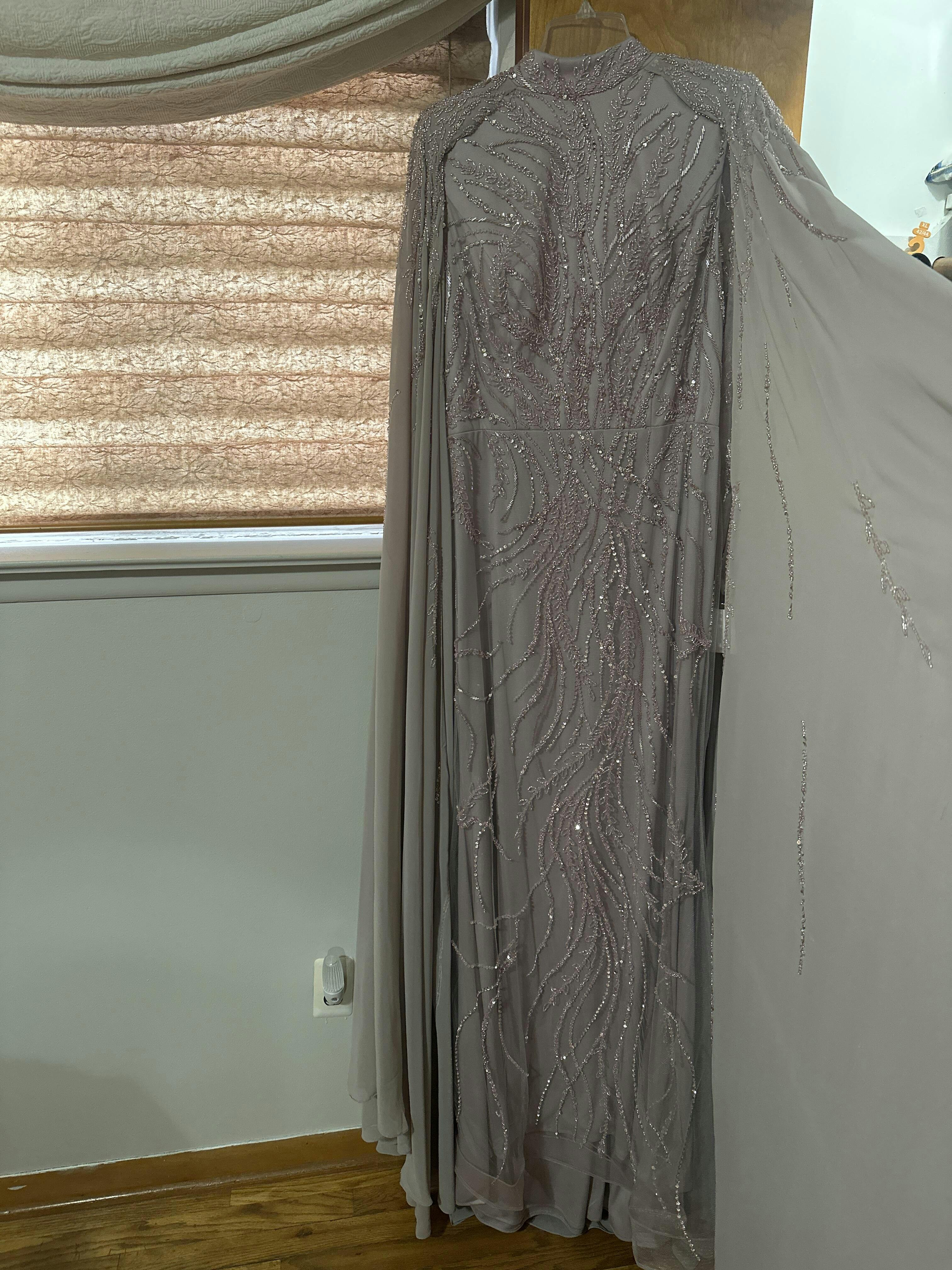 Gracefully modest, this sage green evening gown features flowing cape and long sleeves, delicate detailing, and a flattering silhouette—available in four elegant colors.
