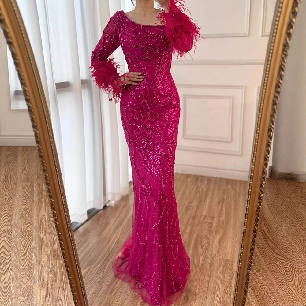 Luxury royal blue mermaid evening dress LA72395 with one-shoulder design, beaded accents, and feather details, perfect for weddings and formal parties.