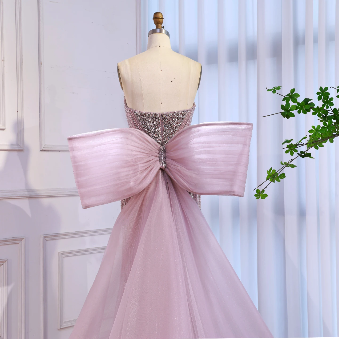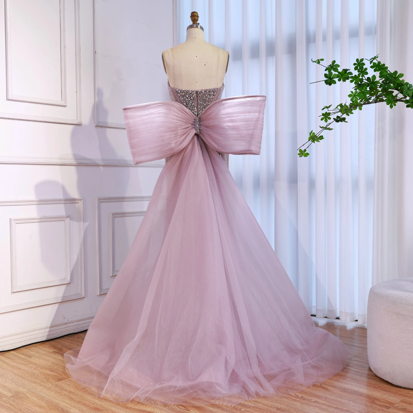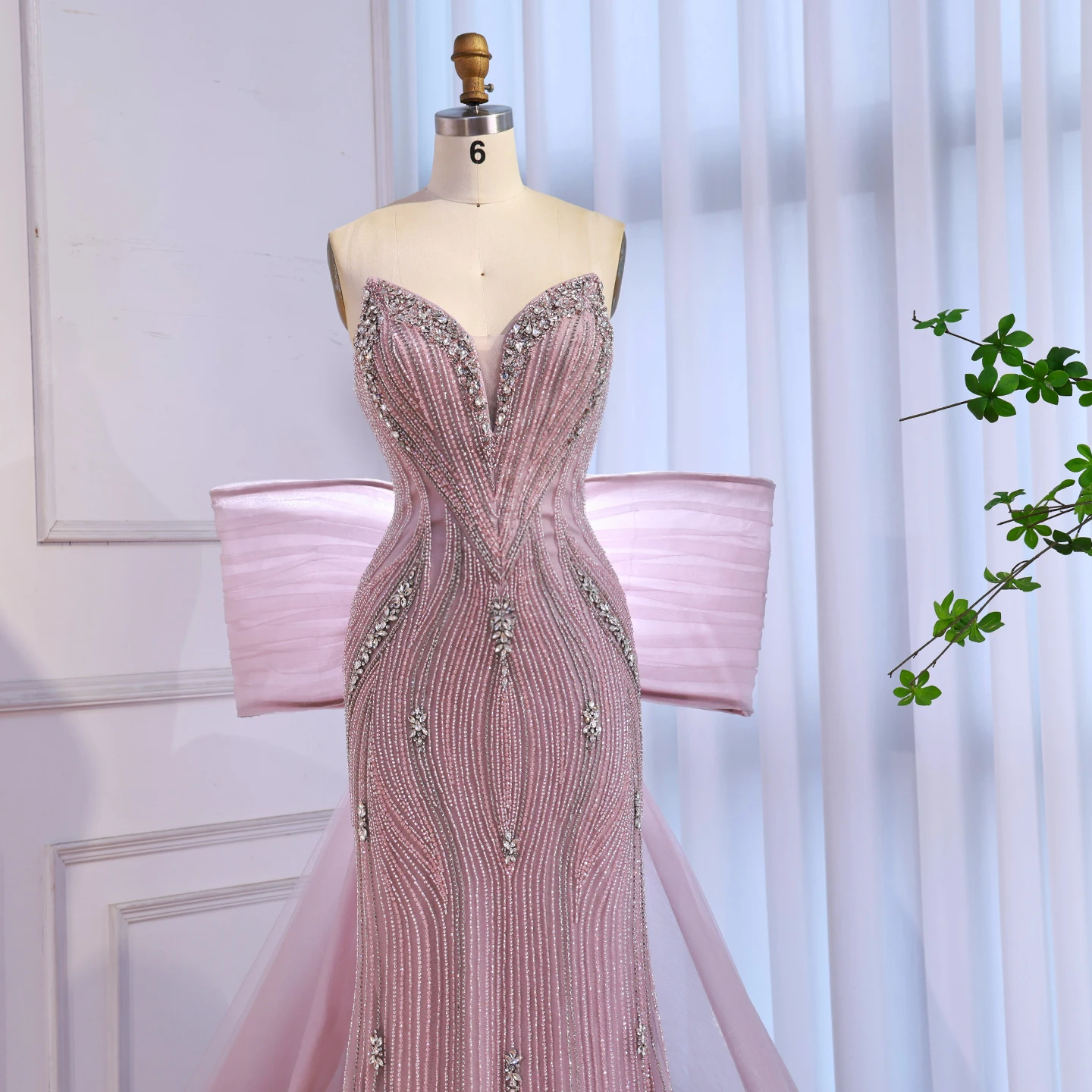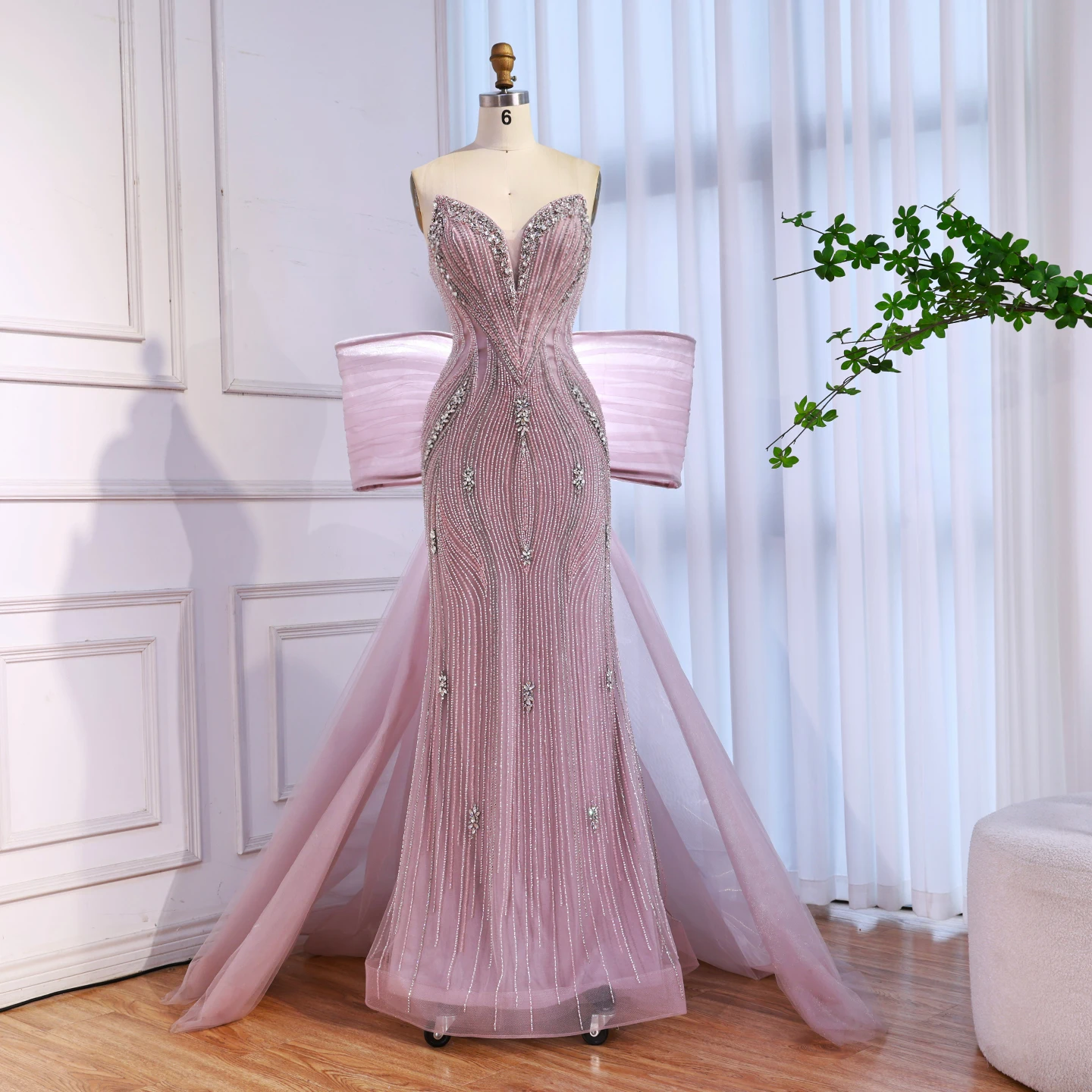 Chic pink mermaid evening dress with a dramatic oversized bow. Elegant and modern design for formal events and red carpet occasions. Style meets glamour.