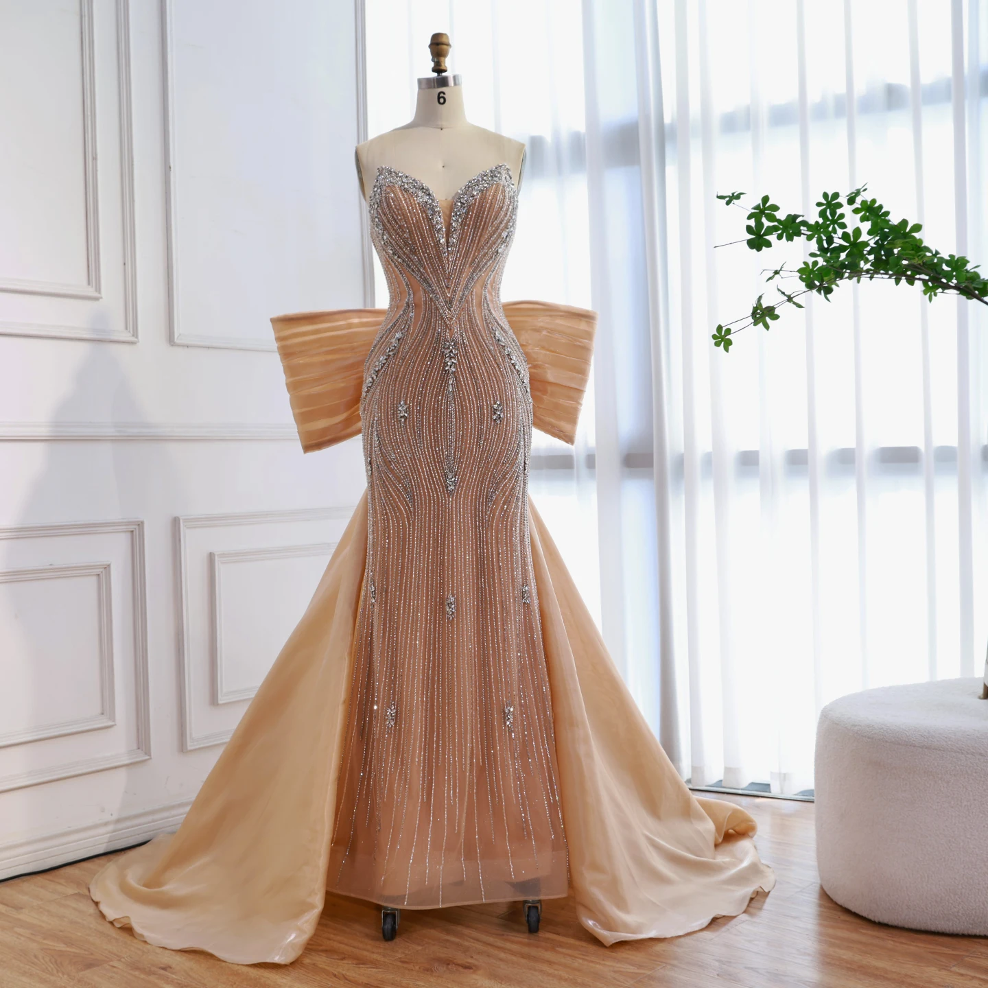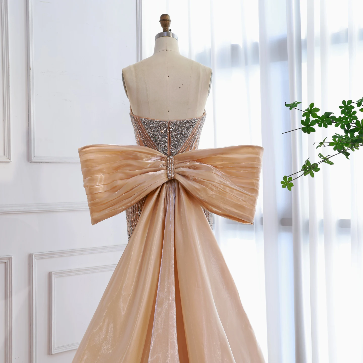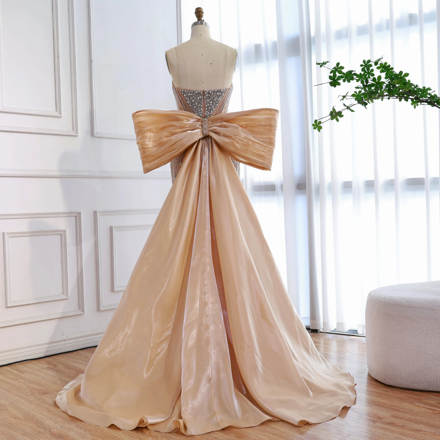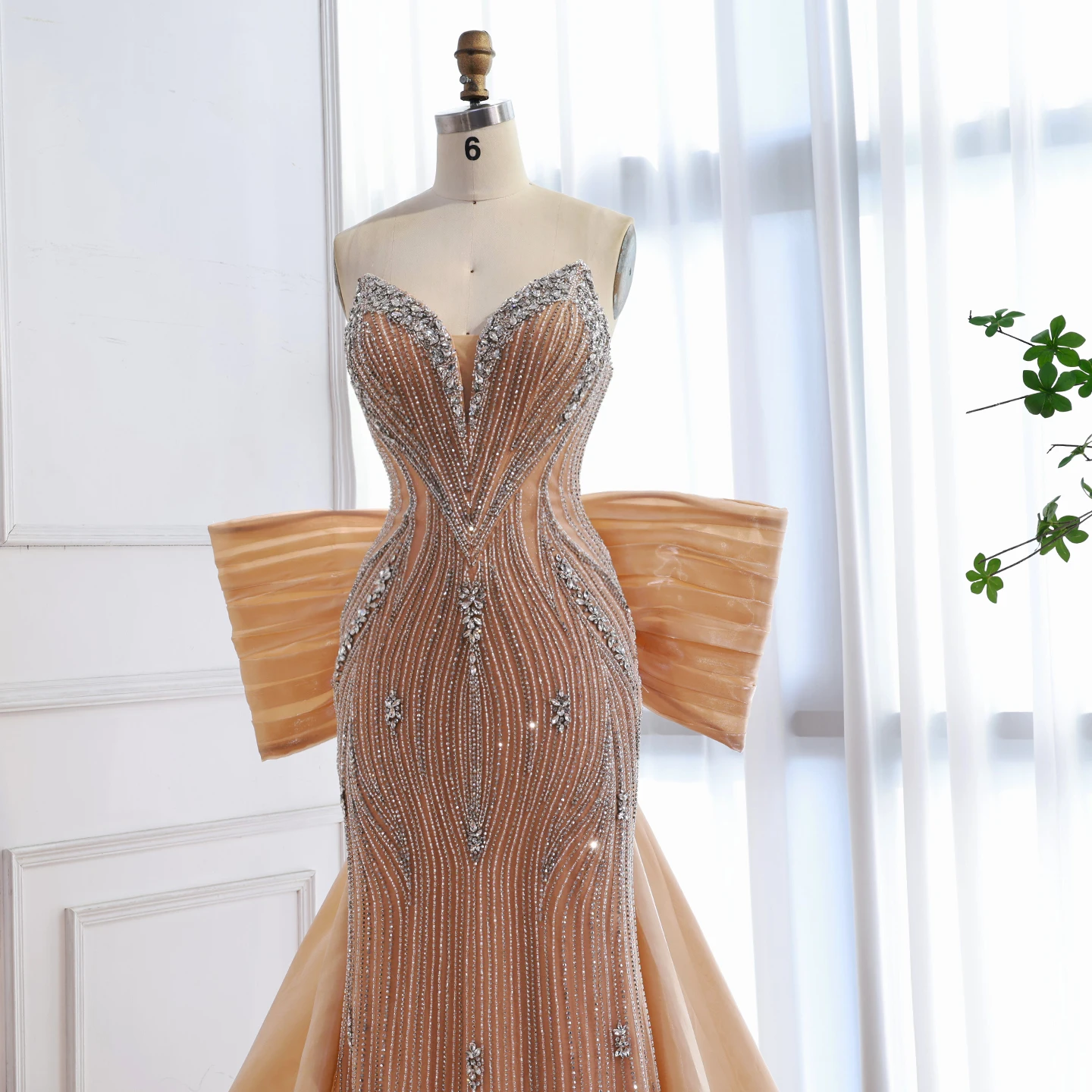 Chic pink mermaid evening dress with a dramatic oversized bow. Elegant and modern design for formal events and red carpet occasions. Style meets glamour.