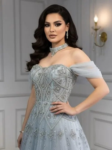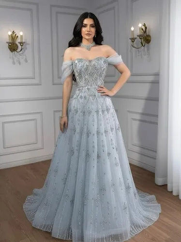 Luxury Gray Blue A-Line Dreamy Beaded Evening Dress With Necklace LA73397