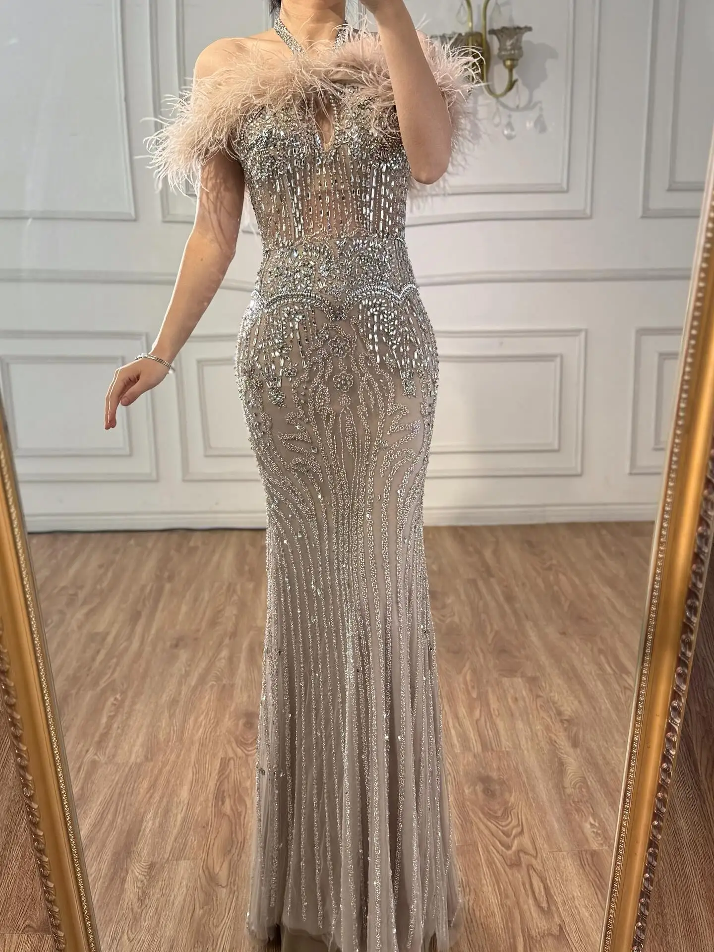 Luxury Nude Halter Feather Crystal Evening Dress LA73349