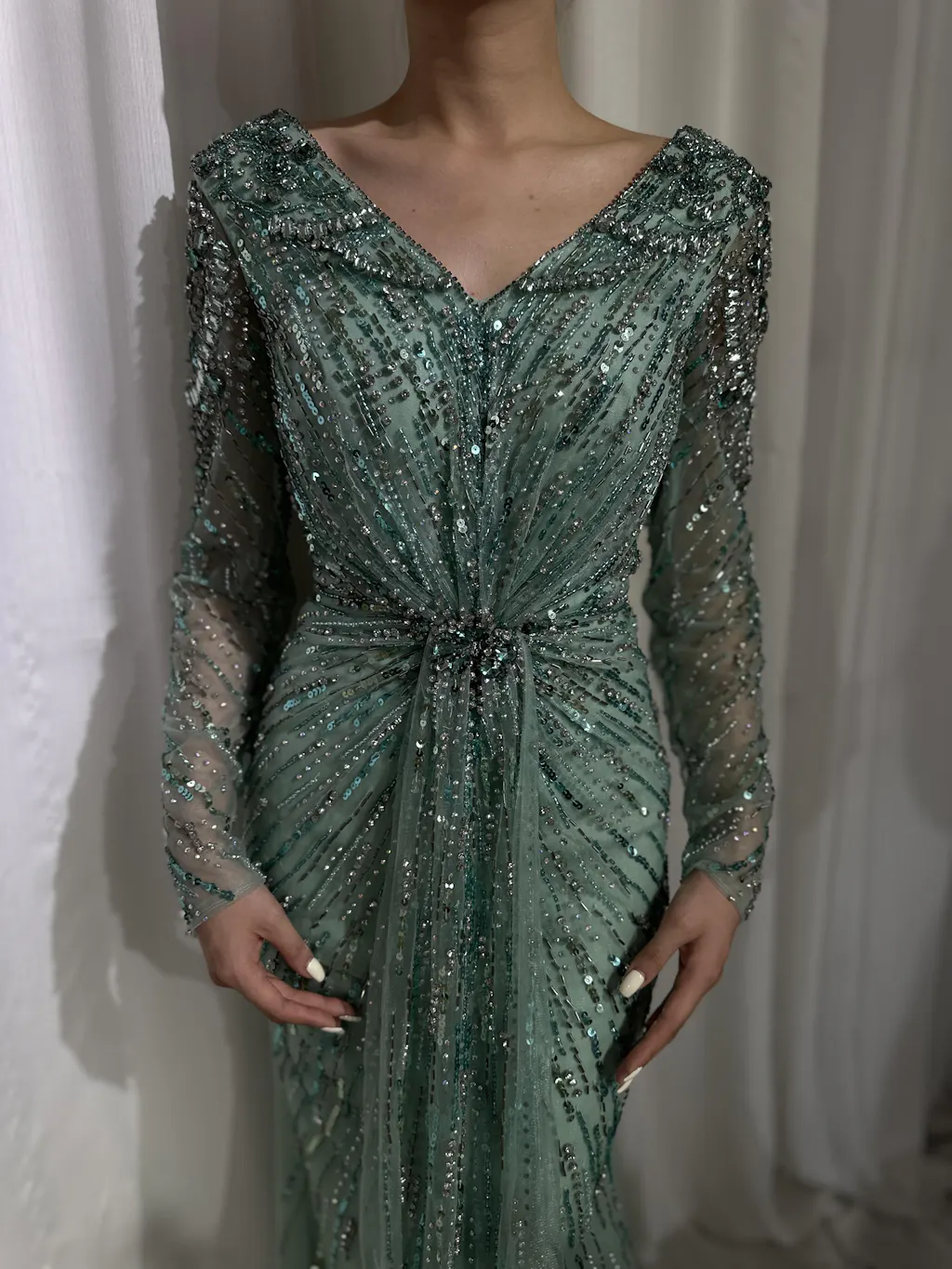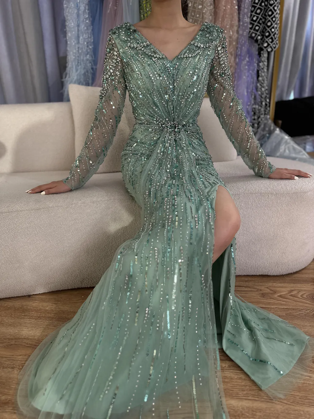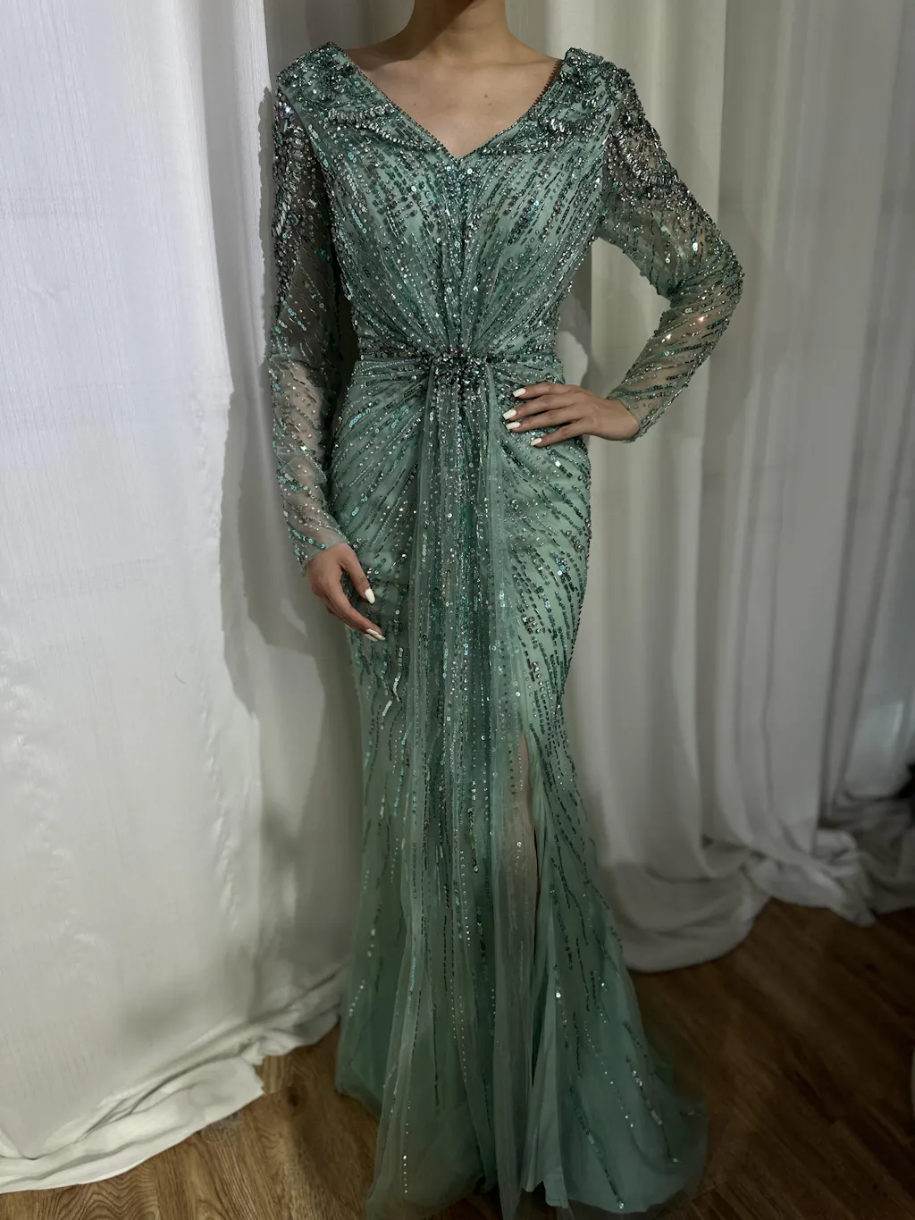Discover LA72007 – a luxury designer Arabic turquoise mermaid split evening gown from a renowned British brand, once endorsed by a UK princess. Experience opulent elegance for your next formal event.