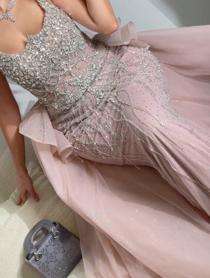 Elegant luxury Dubai nude Saudi spaghetti strap evening gown LA72810, beaded with overskirt design, perfect for weddings, galas, and formal occasions.