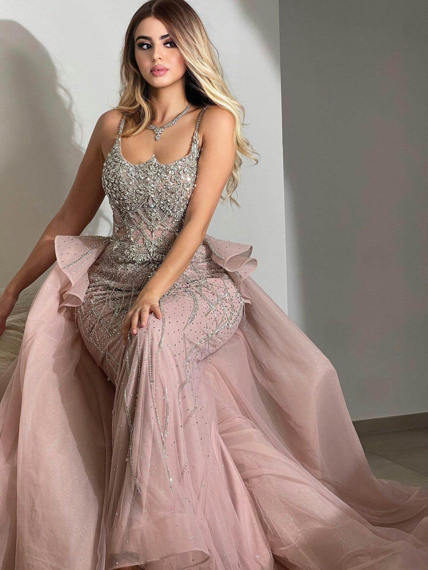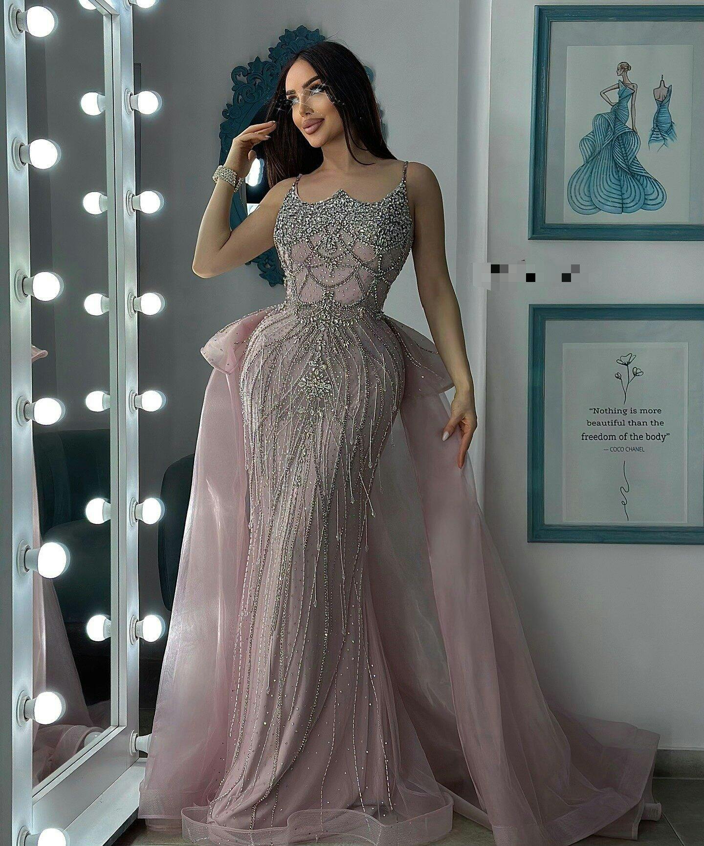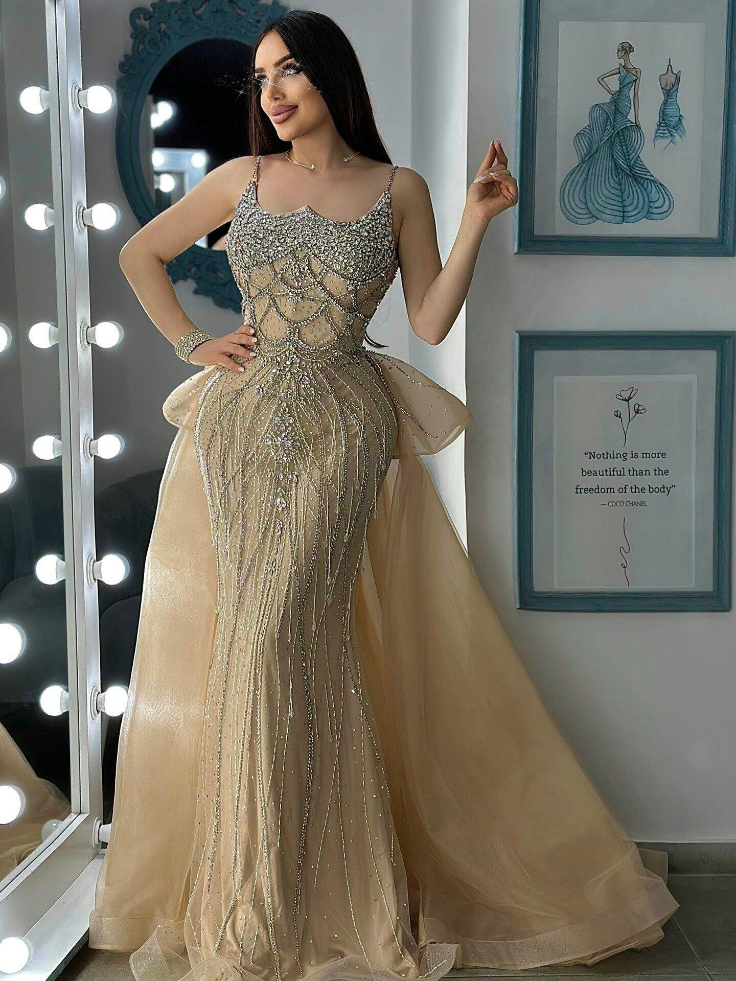 Luxury Dubai Nude Saudi Beaded Spaghetti Strap Evening Dress with Overskirt LA72810