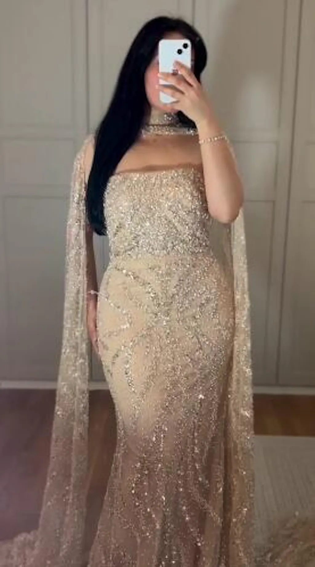 Luxury Nude Beaded Evening Dress with Cape Sleeves LA72824