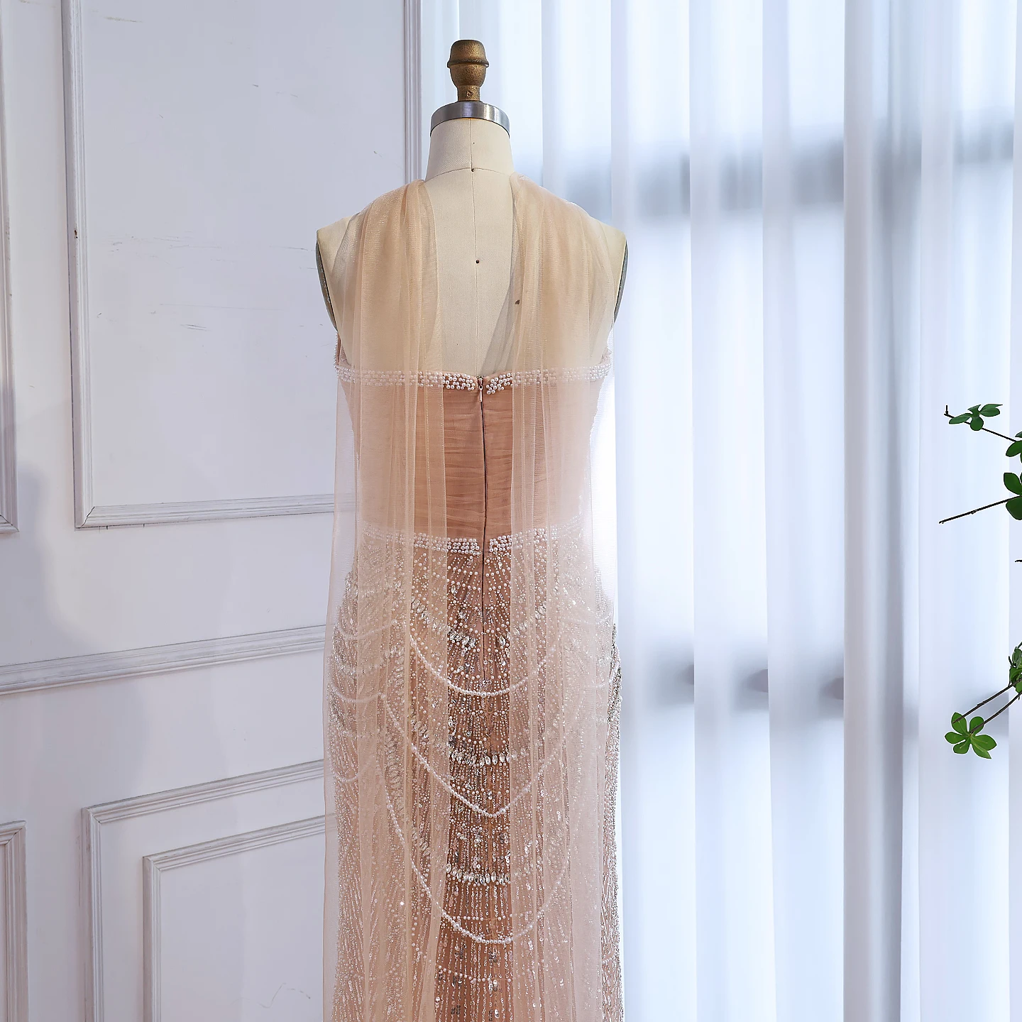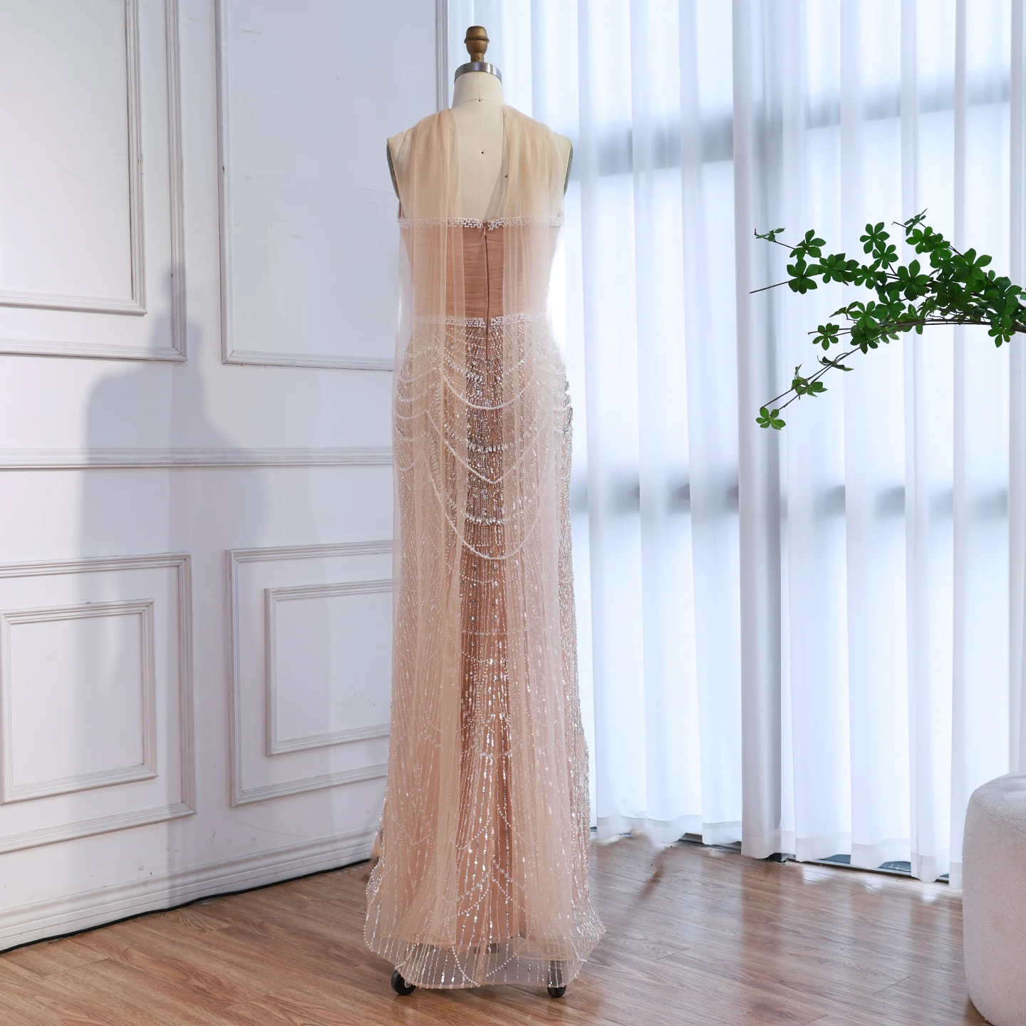 Luxury nude crystal mermaid evening dress inspired by Dubai and Kosovo designer styles. Perfect for wedding guests with a glamorous elegant look.