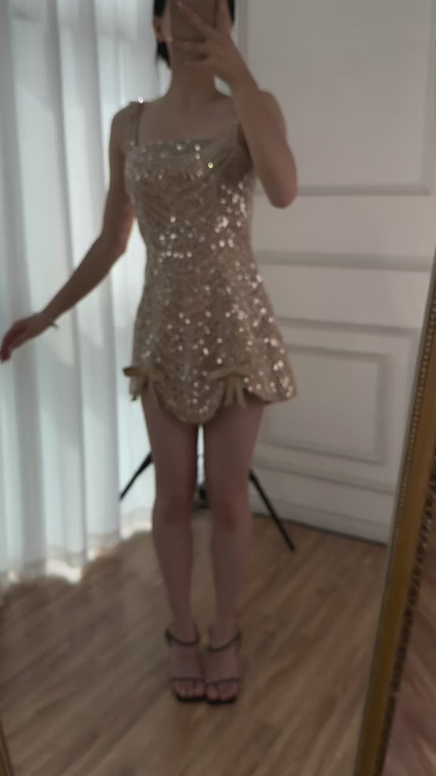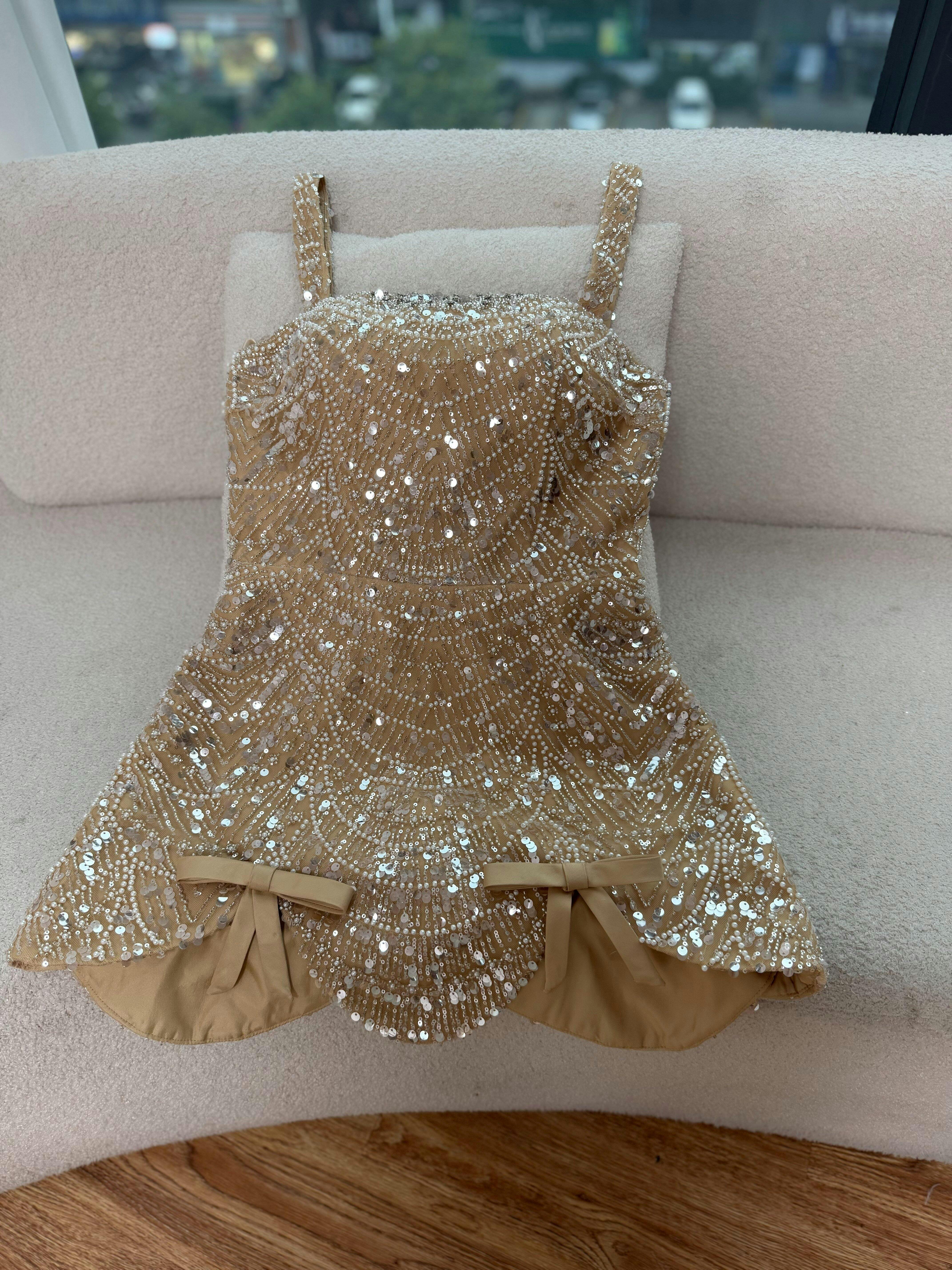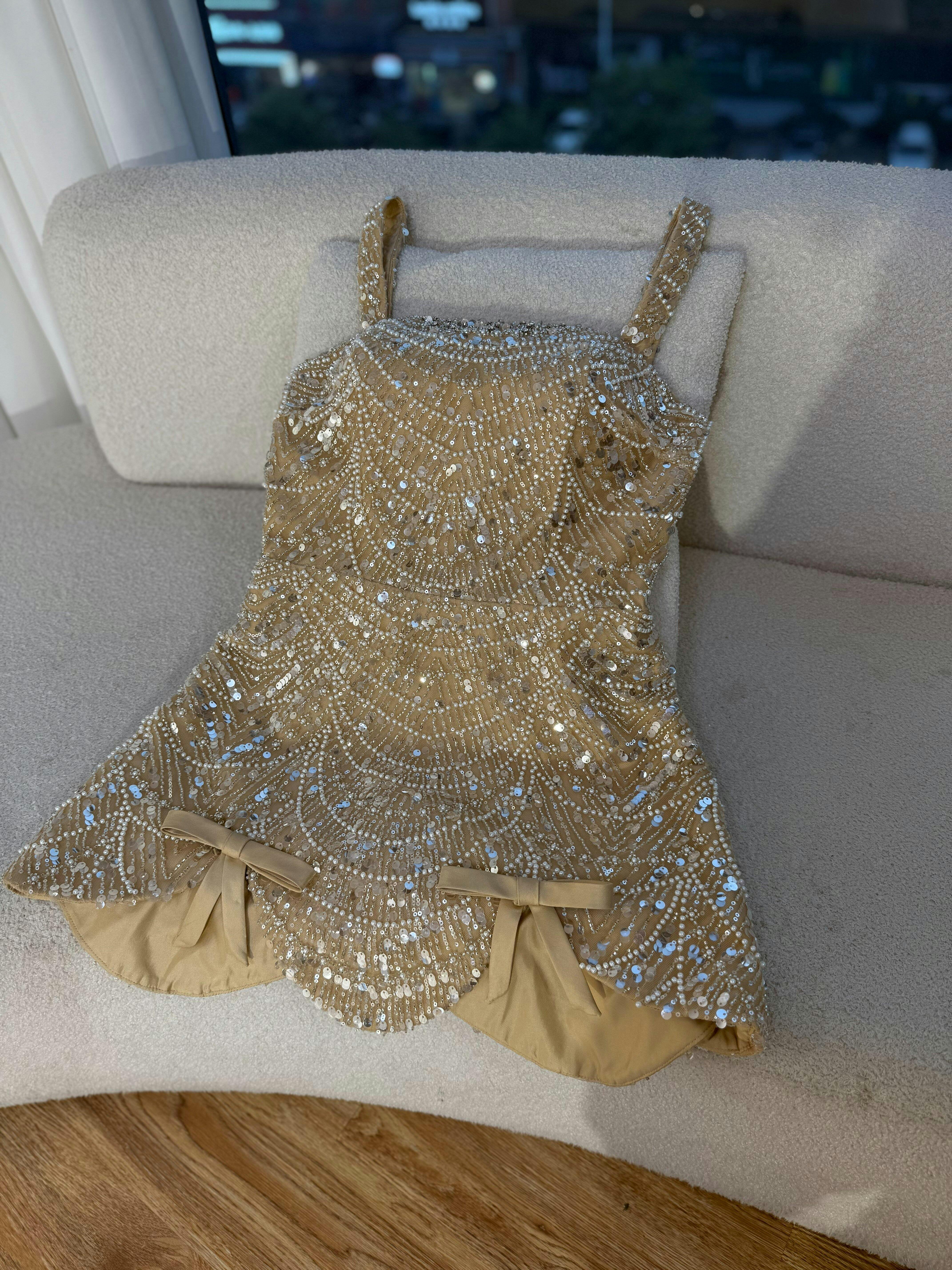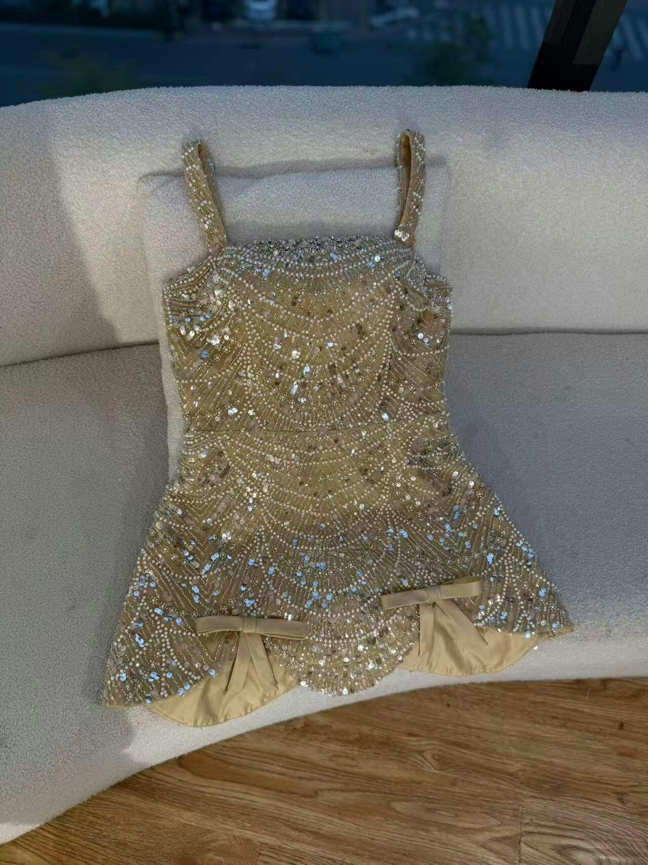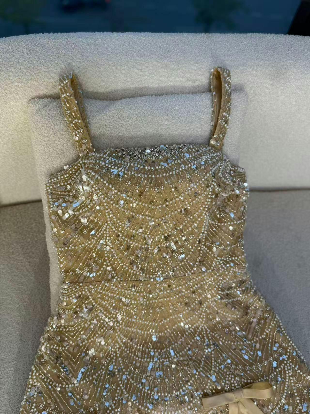 Luxury Nude Pearl Beaded A-Line Mini Evening Dress LA73211