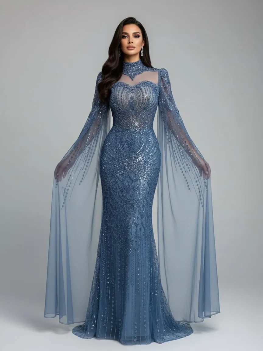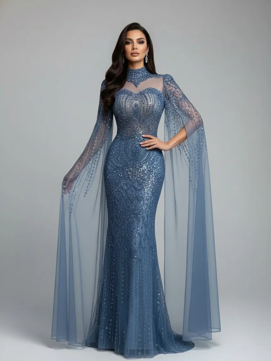 Elegant modest blue mermaid evening dress with a flowing cape design. Ideal for Muslim formal occasions, galas, or weddings.