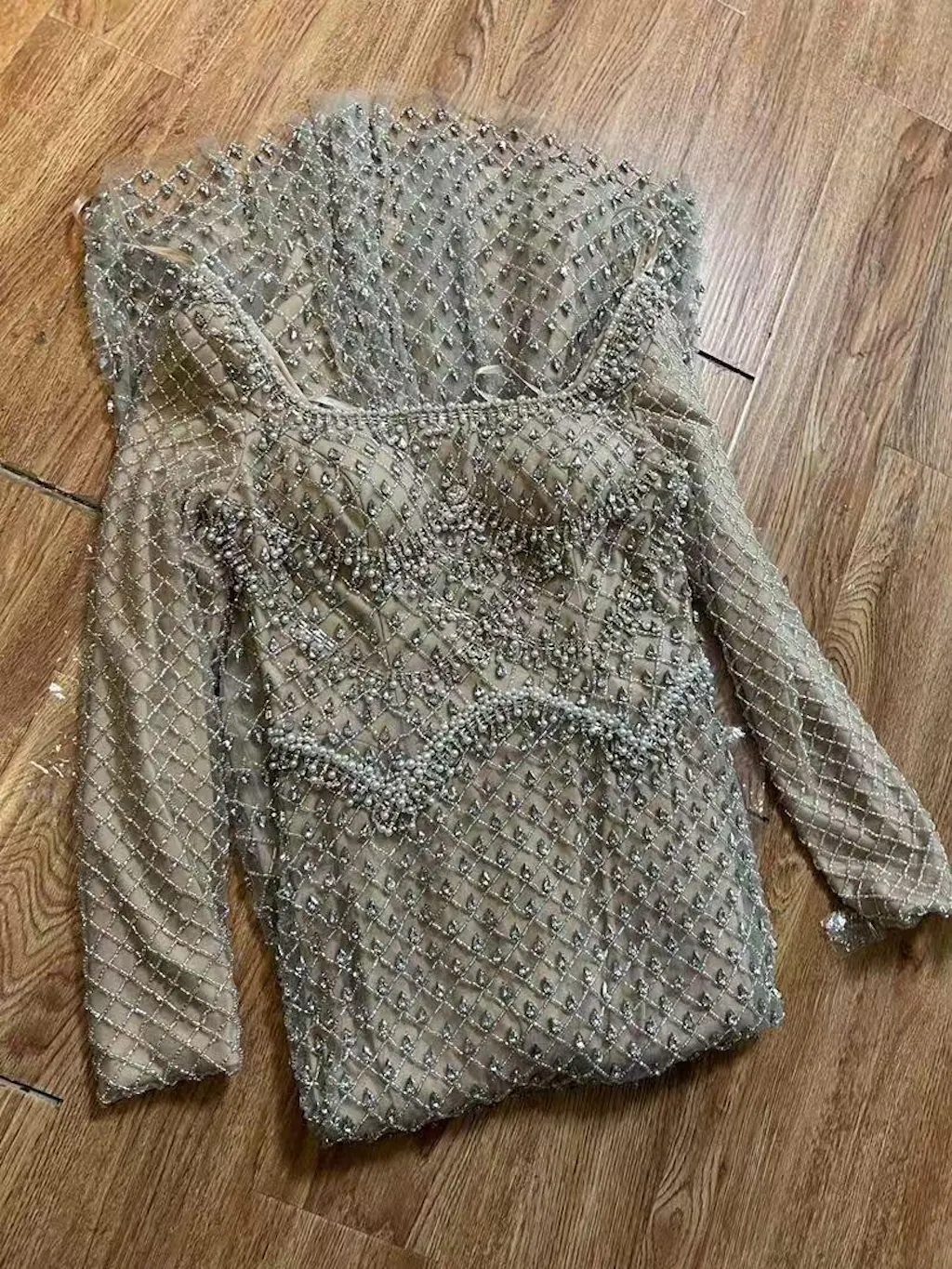 Elegant mermaid evening dress with long sleeves, featuring modest styling and delicate pearl beading. Perfect for formal events and refined, timeless charm.