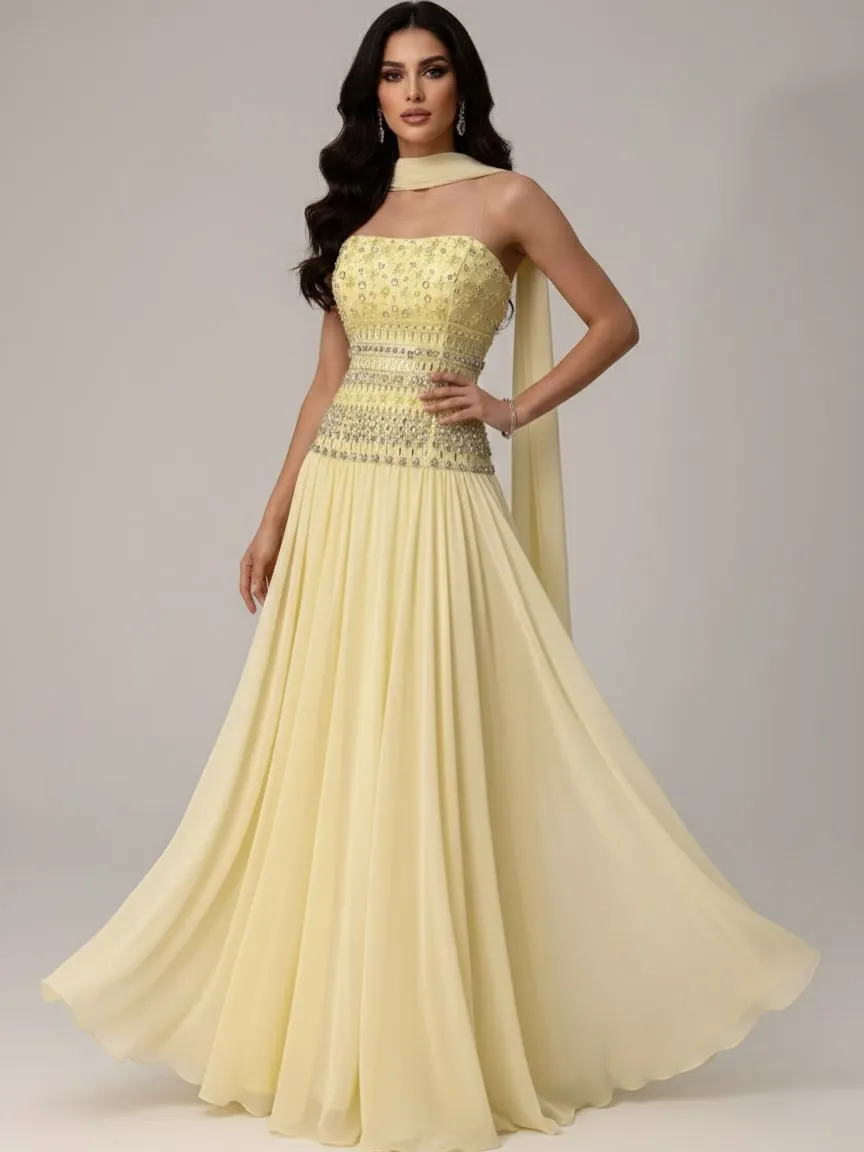 Luxury lilac strapless Arabic evening dress with elegant beadwork in an A-line silhouette. Ideal for weddings and formal events.