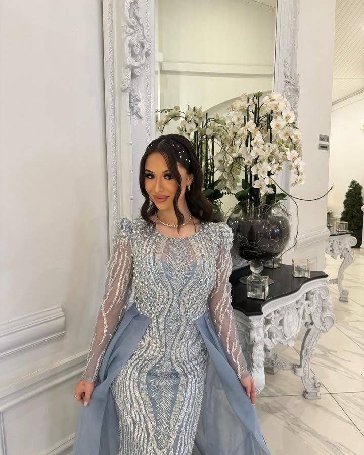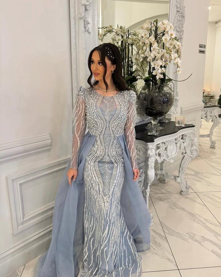 Serene Hill Muslim Blue Mermaid Over Skirt Evening Dresses Beads Puff Shoulder Formal Gowns 2025 For Women Party LA72030
