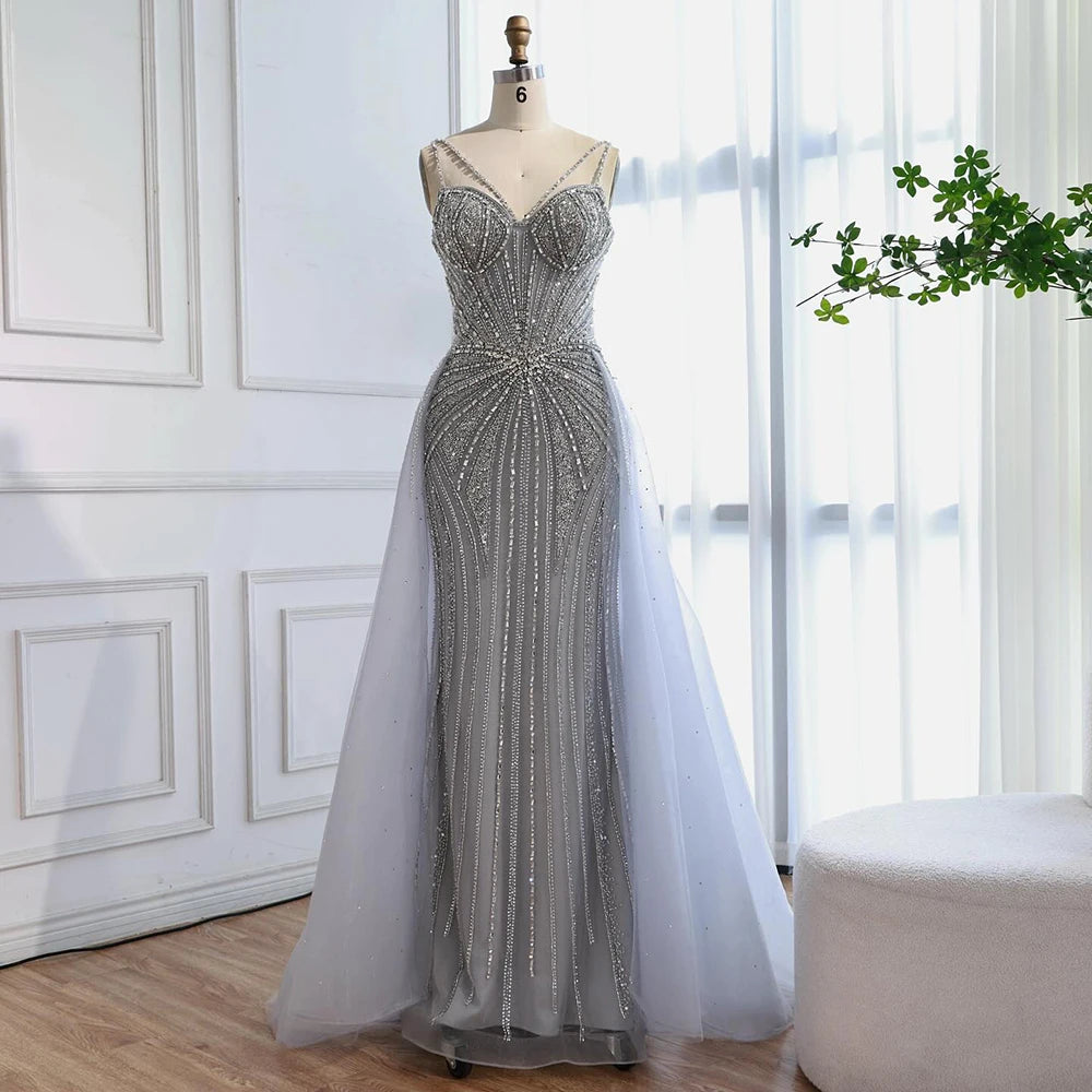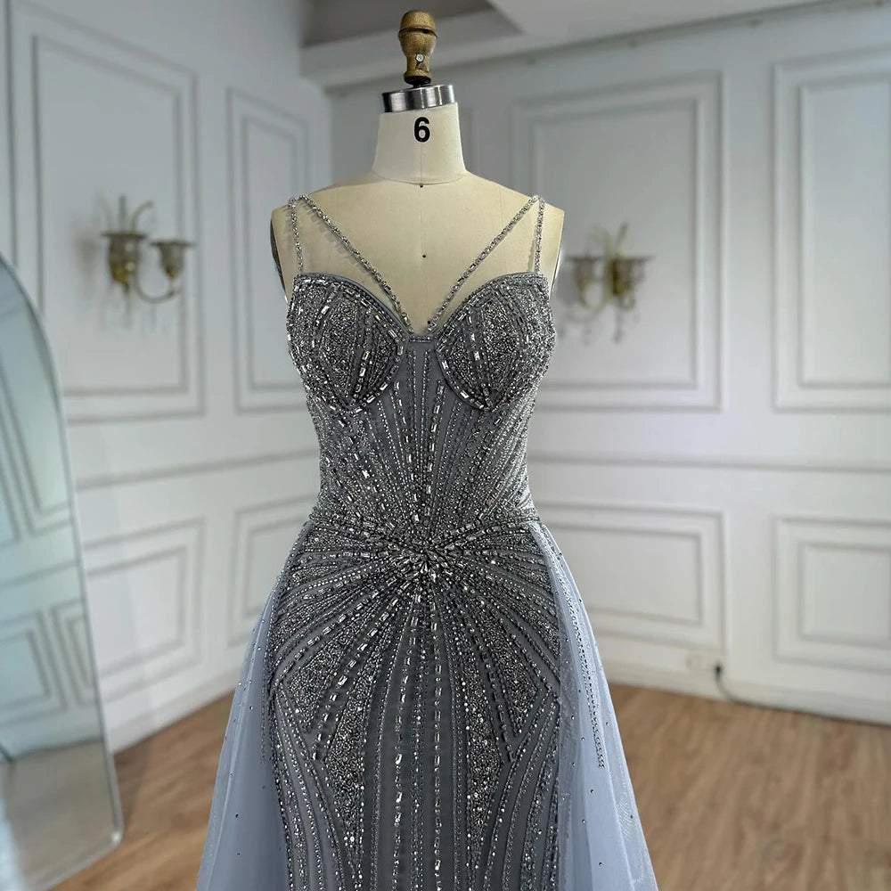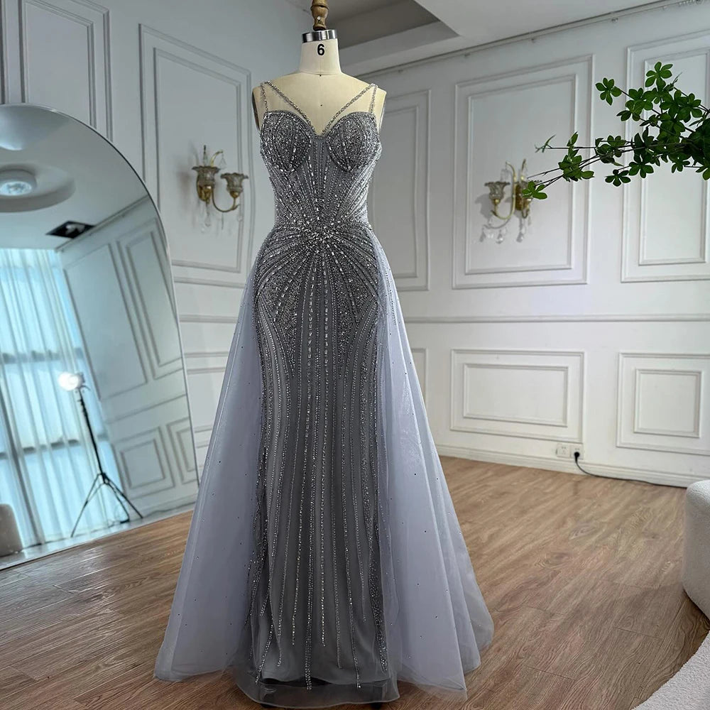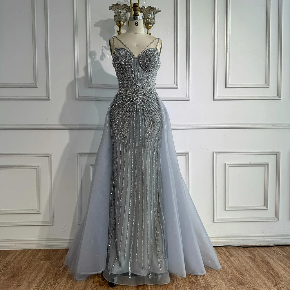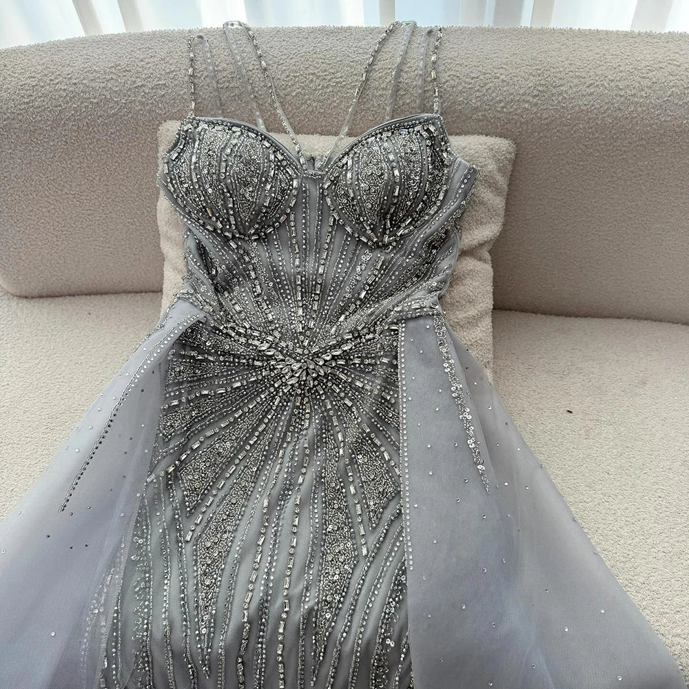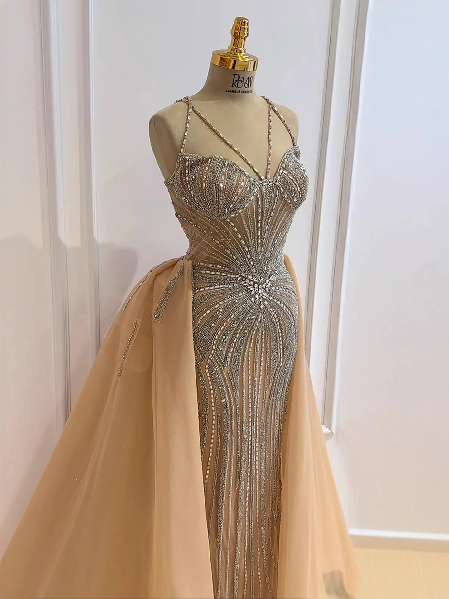 Luxury Nude Spaghetti Strap Mermaid Evening Dress with Overskirt Beaded LA73090