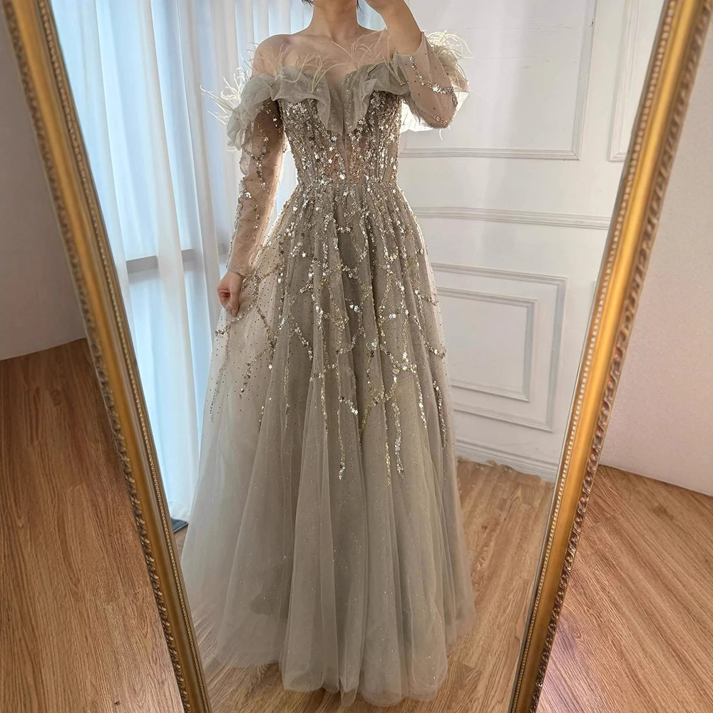 Luxury Caramel Beaded Feather A-Line Sparkle Evening Dress LA71328A
