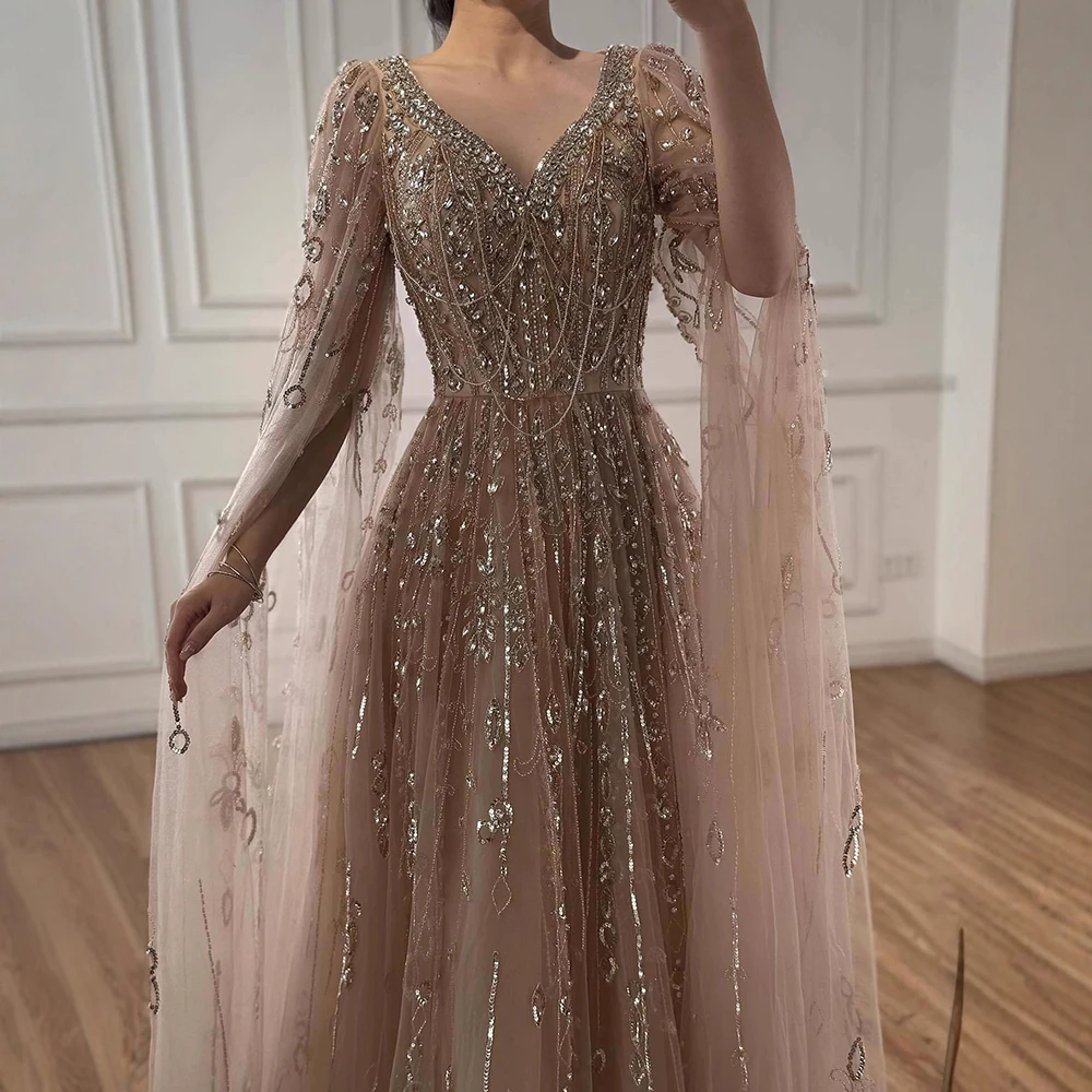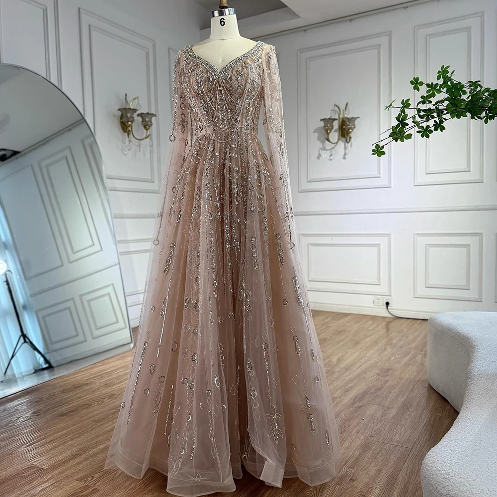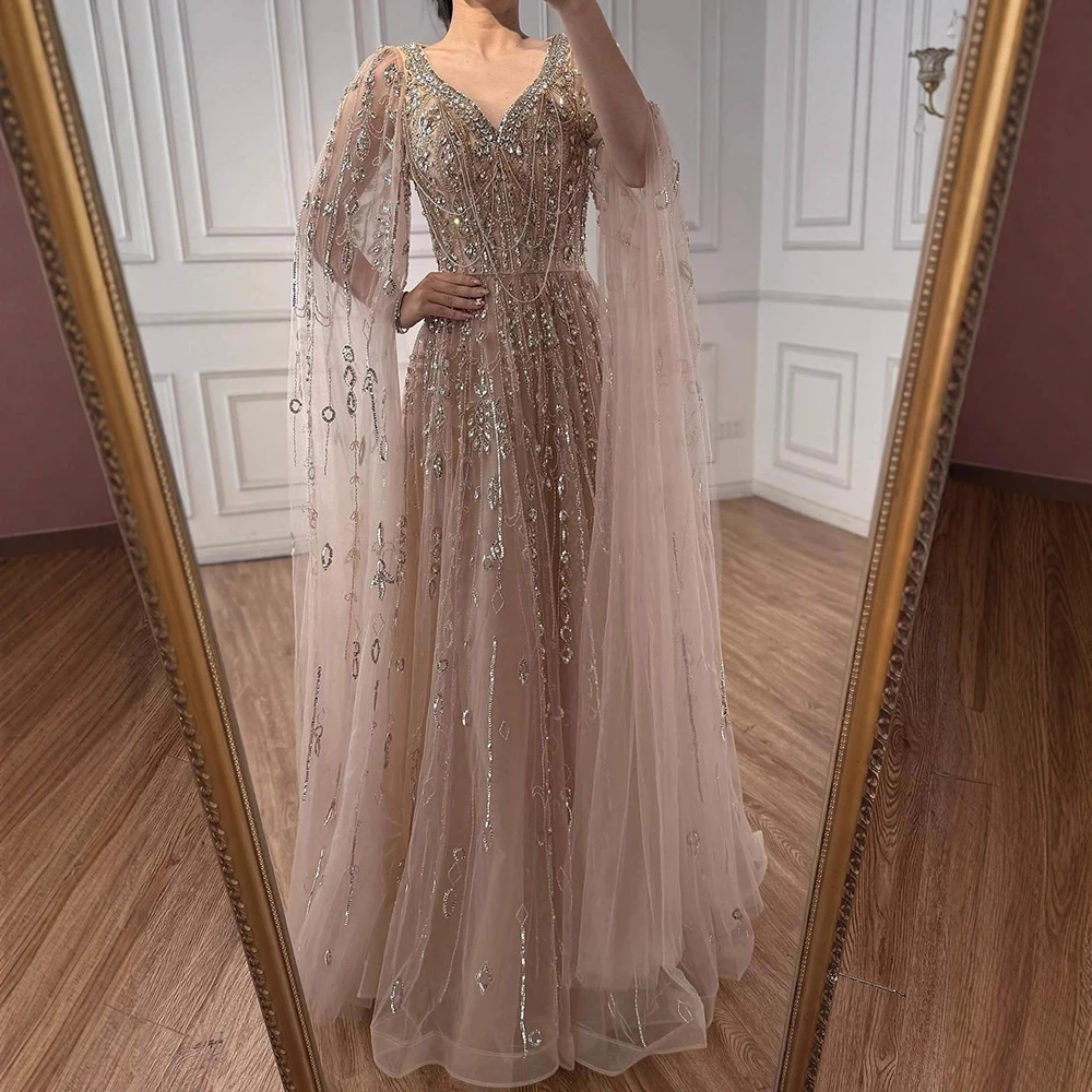 Luxury Nude Beaded Evening Dress with Cape Sleeves for Formal Occasion LA72764A