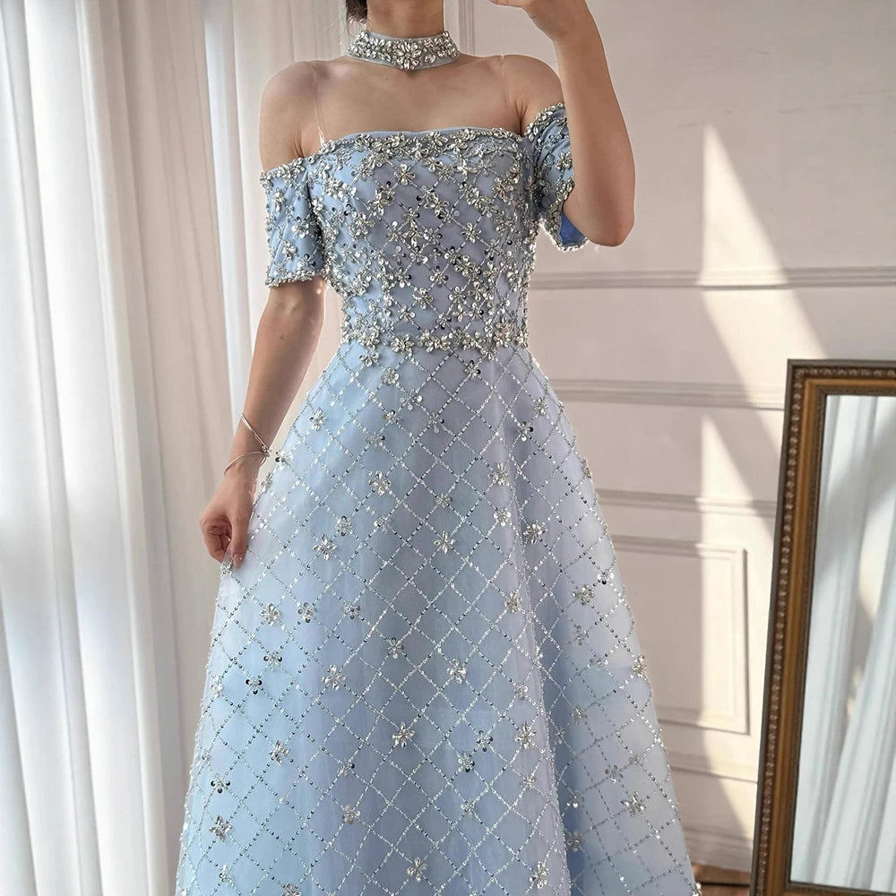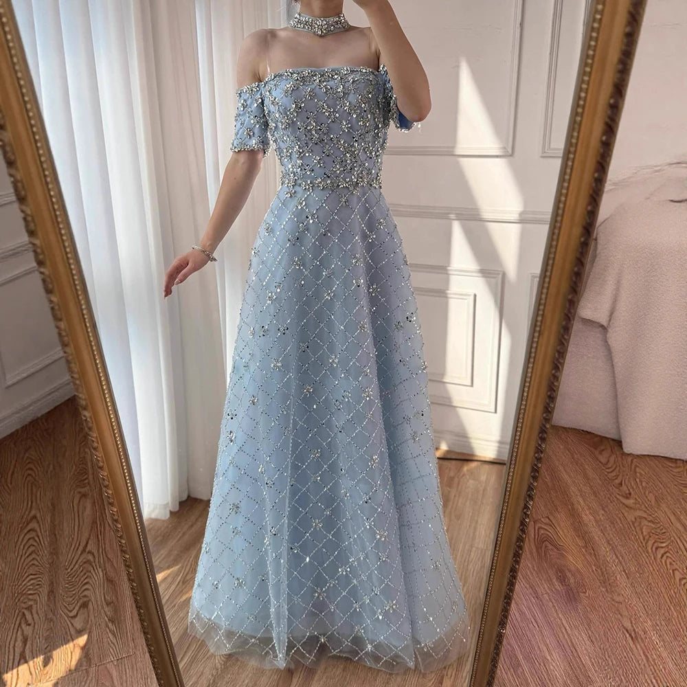 Luxury Nude Sliver Off Shoulder Beaded Crystal A-Line Evening Dress LA73122