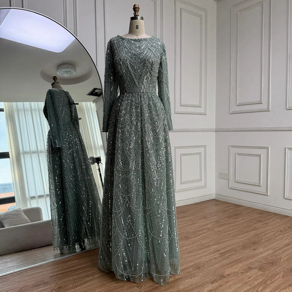 Elegant olive green A-line modest evening dress with refined beading and full-length sleeves—available in multiple colors, perfect for weddings, galas, and formal events.