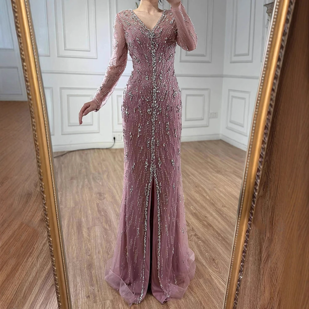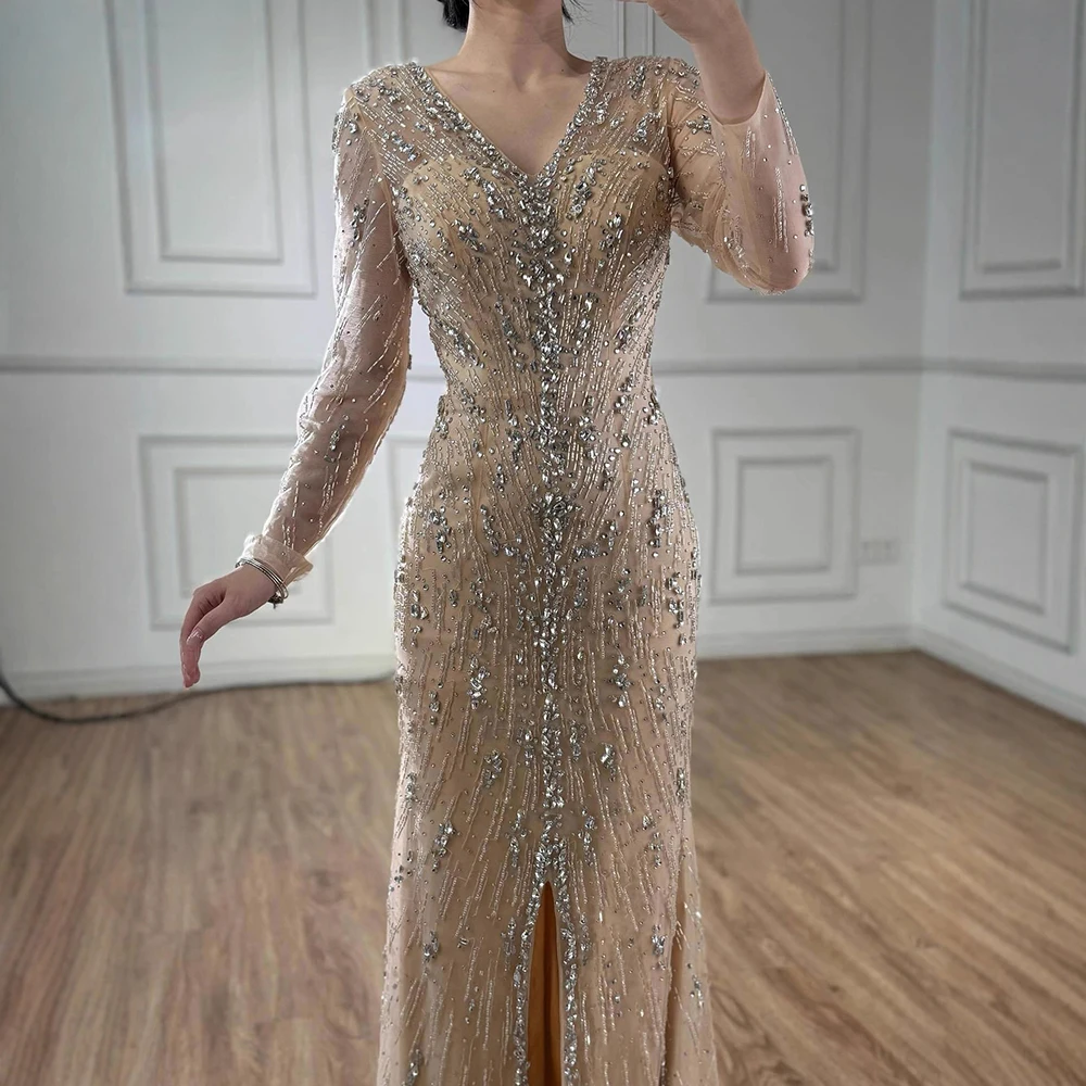 Luxury Turquoise Crystal Beaded Evening Dress Elegant Slit Gown LA73179