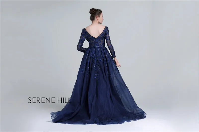 Sale Serene Hill 2025 Dark Blue Deep-V Tulle Evening Dresses Newest Long Sleeve Appliques Sequined Gowns LA6099